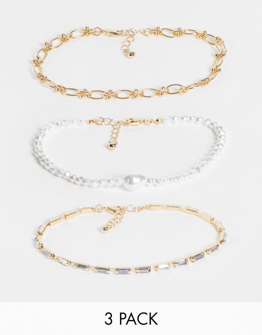 Pack de 3 tobilleras doradas con diseño de cristales de corte baguette y perlas de ASOS DESIGN