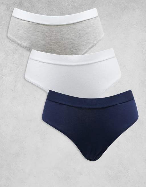 Pack de 3 braguitas brasileñas de color azul marino, gris y blanco de talle alto de algodón de ASOS DESIGN