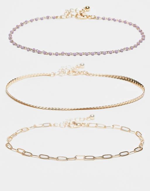 Pack de 3 tobilleras doradas con diseño de cadenas y cuentas moradas de ASOS DESIGN