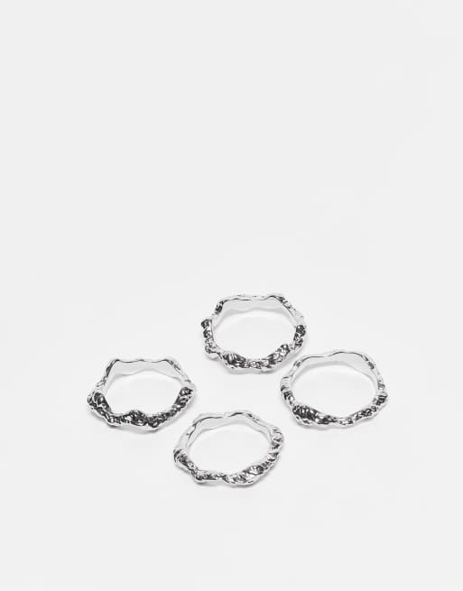 Pack de 4 anillos plateados apilables con diseño repujado de ASOS DESIGN