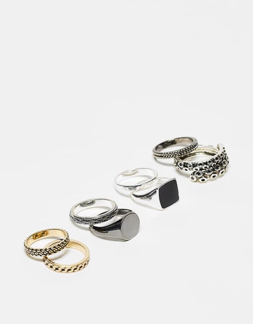 Pack de 8 anillos variados de tono plateado, negro y dorado con diseño de cuerda y pulpo de ASOS DESIGN