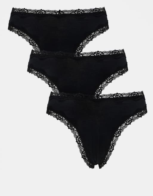 Pack de 3 tangas de talle alto en algodón con ribete de encaje en negro Malibu de ASOS DESIGN