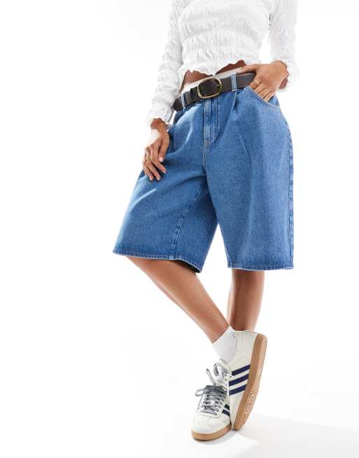 Pantalones cortos vaqueros azul medio de corte alargado con pinzas de ASOS DESIGN