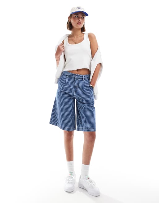 Pantalones cortos vaqueros azul medio de sastre y corte alargado con raya diplomática de ASOS DESIGN (parte de un conjunto)
