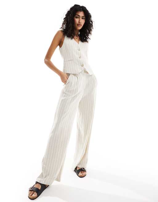 Pantalones de sastre color crudo a rayas de pernera ancha y talle alto con detalle de costuras de lino de ASOS DESIGN