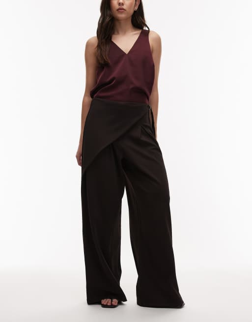 Pantalones de sastre marrón chocolate ceñidos de pernera ancha con detalle cruzado de sarga de ASOS DESIGN