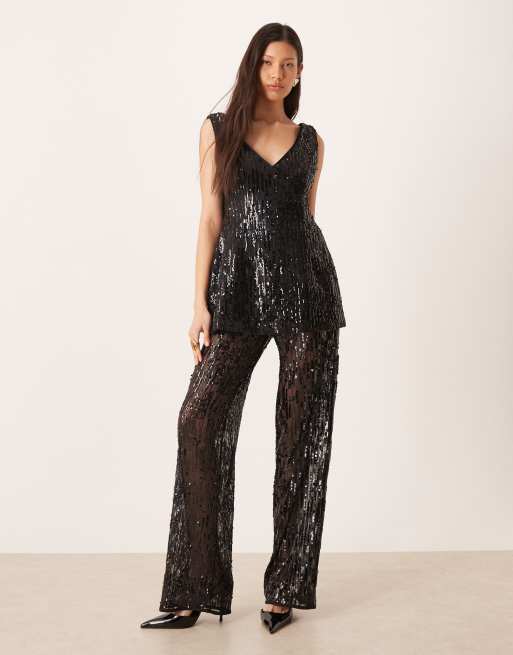 Pantalones de sastre negros de pernera ancha de tejido transparente con lentejuelas de ASOS DESIGN (parte de un conjunto)