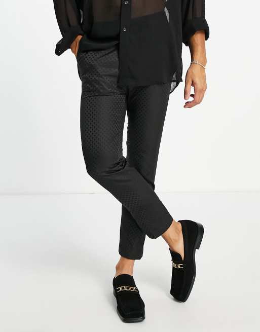 Pantalones de traje negros de corte tapered con diseño de jacquard a tono de satén de ASOS DESIGN