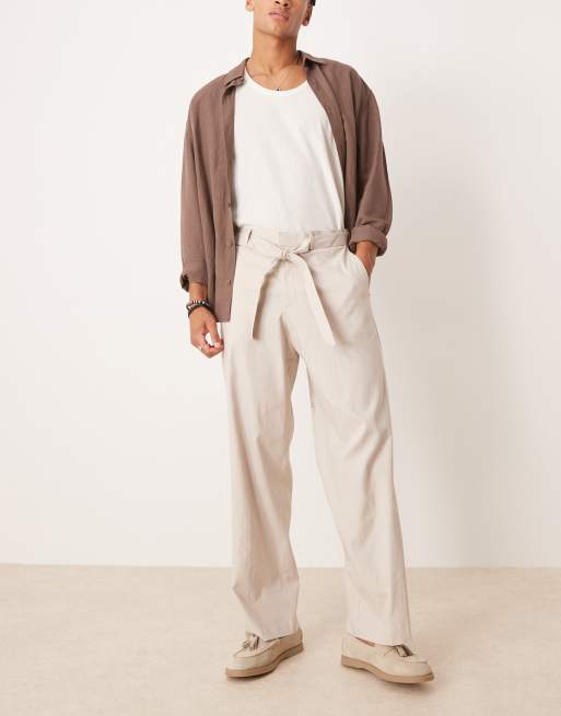 Pantalones de vestir color piedra de pernera ancha con cinturón de mezcla de lino de ASOS DESIGN