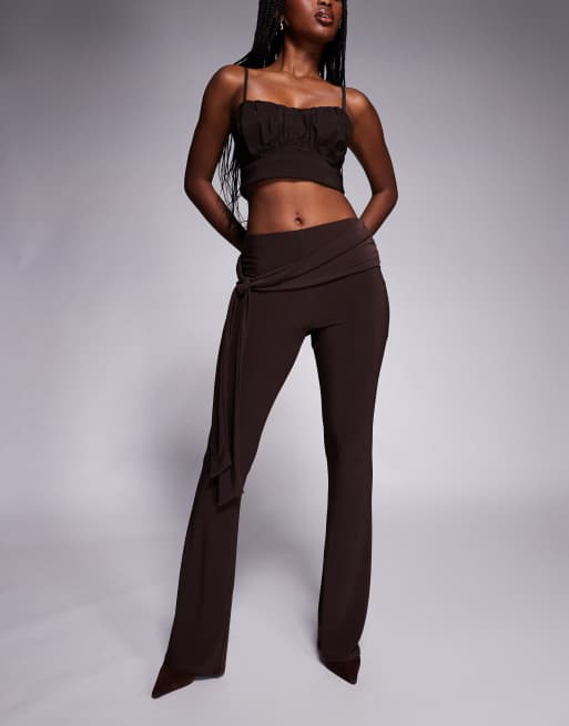 Pantalones marrón chocolate de campana con diseño ceñido y lazada en la cintura de ASOS DESIGN