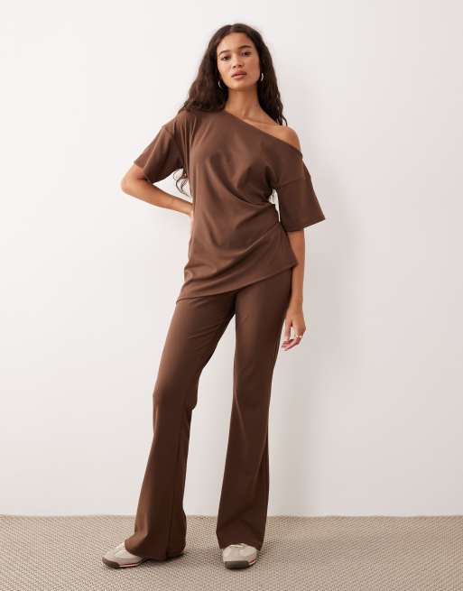 Pantalones marrón chocolate de pernera ancha de canalé fino cepillado de ASOS DESIGN (parte de un conjunto)