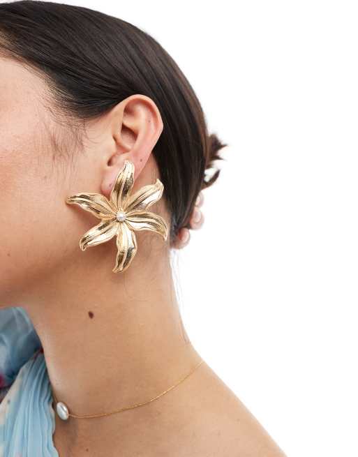 Pendientes de botón en tono dorado pulido extragrandes con diseño de flor y detalle de perla sintética de ASOS DESIGN