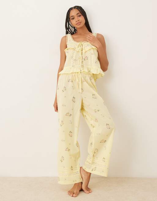 Pijama amarillo limón de pantalones y top de tirantes abotonado con volantes y estampado de florecitas de ASOS DESIGN