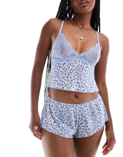 Pijama azul de top de tirantes con estampado de florecitas de malla y encaje de ASOS DESIGN