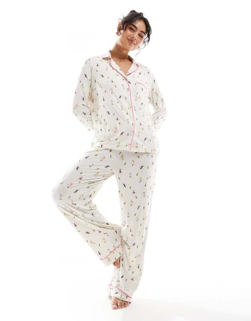 Pijama con estampado de esquiadores de camisa de manga larga y pantalones con ribetes en contraste de tejido supersuave de ASOS DESIGN