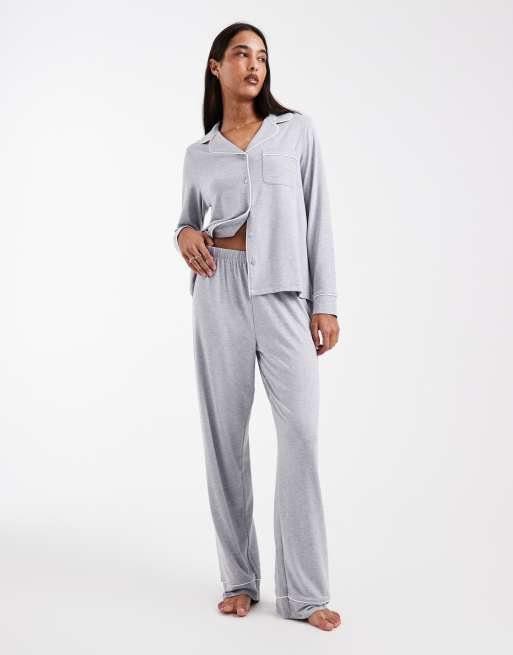 Pijama gris jaspeado de camisa de manga larga y pantalones con ribetes en contraste de tejido supersuave de ASOS DESIGN