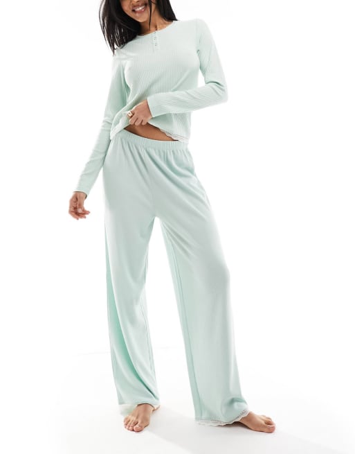 Pijama verde de canalé con ribete de encaje Mix & Match de ASOS DESIGN