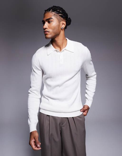 Polo blanco entallado de manga larga de punto de canalé de ASOS DESIGN