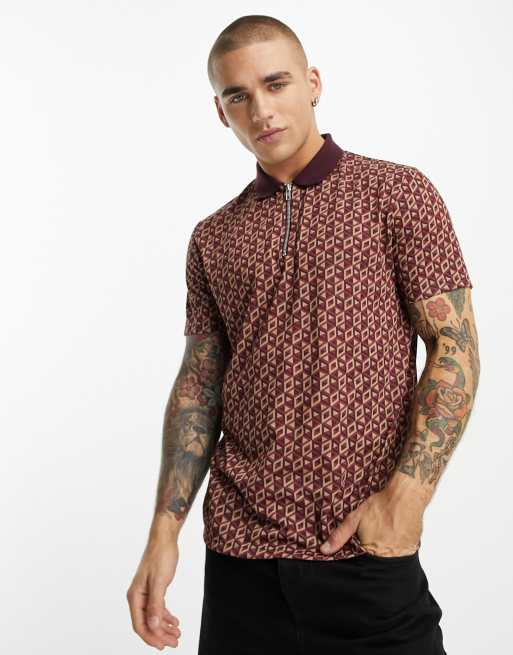Polo burdeos con estampado integral geométrico de ASOS DESIGN - BURGUNDY