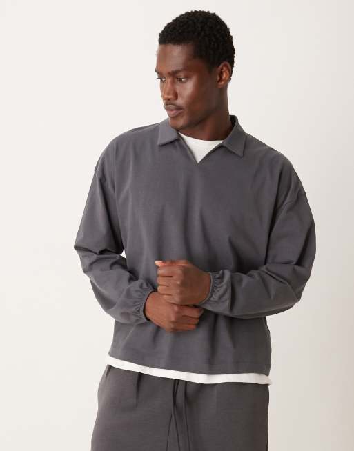 Polo gris carbón extragrande de manga larga con cuello de solapas de ASOS DESIGN