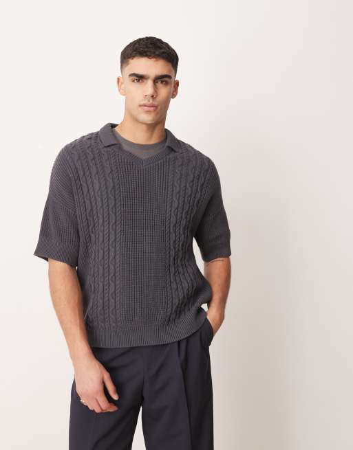 Polo gris carbón holgado con muesca en el cuello de punto de ochos de ASOS DESIGN