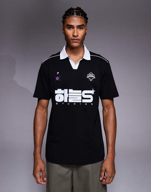 Polo negro holgado con detalle de ribetes y gráfico deportivo de ASOS DESIGN