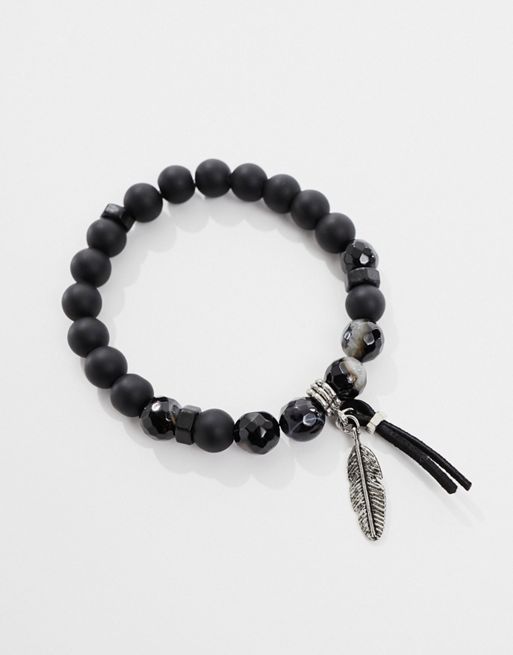 Pulsera de cuentas negras con piedras de ágata y detalle de pluma de ASOS DESIGN