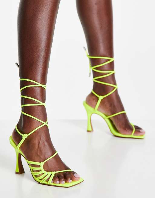 Sandalias amarillo neón de tacón medio con diseño enrejado anudado a la pierna Herald de ASOS DESIGN