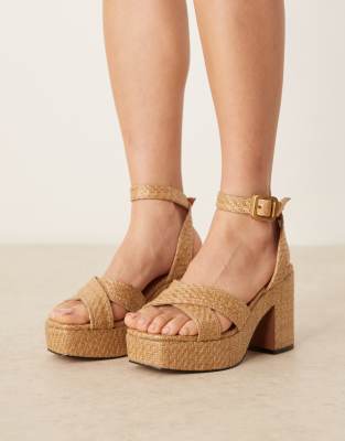 Sandalias beis de tacón medio con plataforma de rafia Henley de ASOS DESIGN Wide Fit