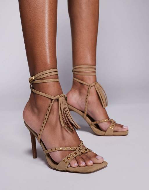 Sandalias color arena de tacón alto con detalle de flecos Neigh de ASOS DESIGN