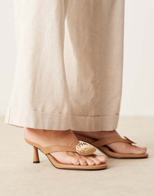 Sandalias color camel con tira de dedo, tacón medio y detalle de herraje Heated de ASOS DESIGN