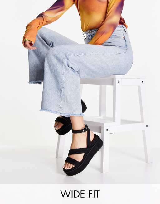Sandalias negras con diseño de tiras acolchadas y plataforma plana Tailor de ASOS DESIGN Wide Fit