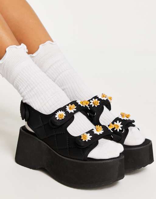 Sandalias negras de estilo deportivo con plataforma plana y detalle de margaritas Task de ASOS DESIGN