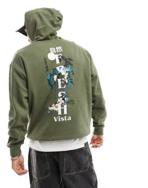 Sudadera caqui extragrande con capucha y estampado de cascada en la columna de ASOS DESIGN