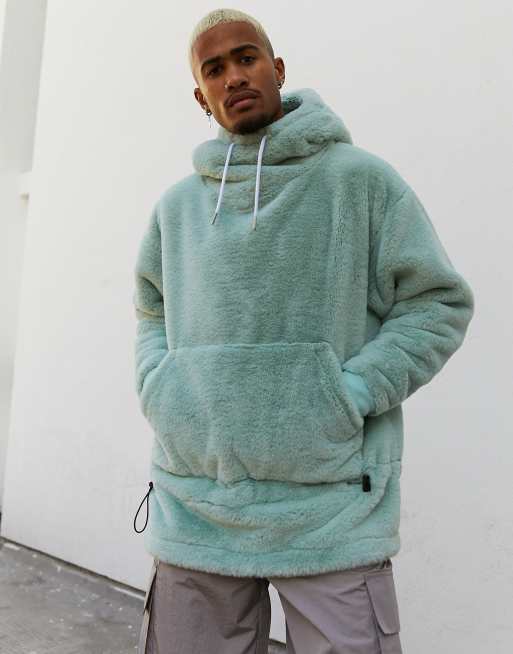 Sudadera con capucha extragrande de piel sintética con cuello alto y detalle de cordones elásticos en azul grisáceo de ASOS DESIGN
