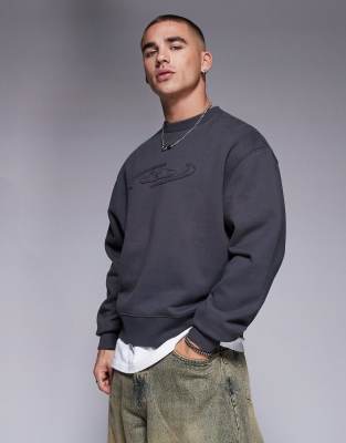 Sudadera gris carbón de corte cuadrado con cuello redondo, estampado en el pecho y aplicación con bordes sin rematar de tejido grueso de 400 g/m² premium de ASOS DESIGN