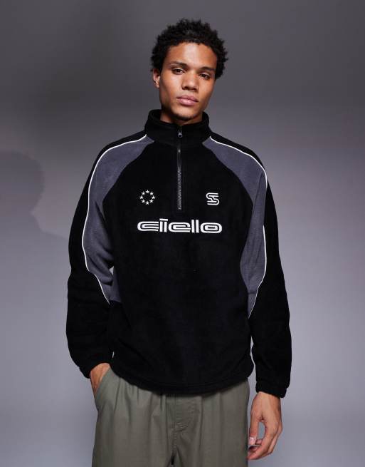 Sudadera negra holgada con estampado en el pecho, paneles en contraste, cuello alzado y cremallera corta de felpa de ASOS DESIGN
