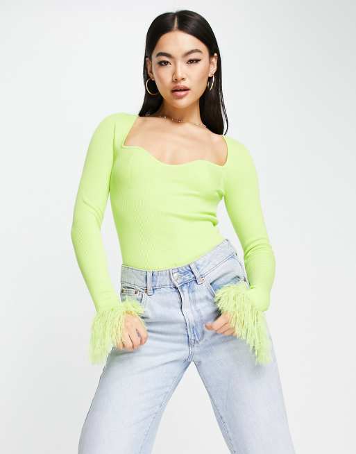 Top amarillo lima de punto con escote corazón y ribetes de plumas sintéticas de ASOS DESIGN