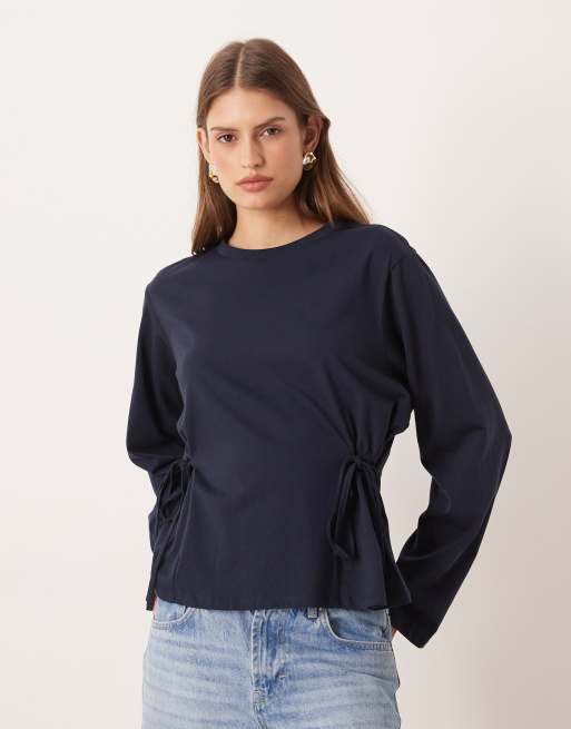 Top azul marino de manga larga con detalle de lazada en la cintura de ASOS DESIGN