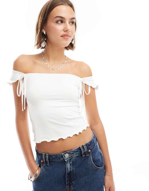 Top blanco con escote Bardot, detalle de lazo y borde ondulado de ASOS DESIGN