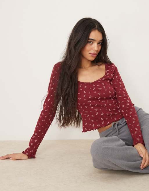 Top burdeos con cuello ancho y estampado de florecitas de punto gofrado de ASOS DESIGN