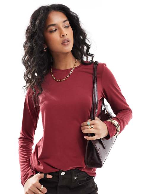 Top burdeos de manga larga con cuello redondo de modal de ASOS DESIGN