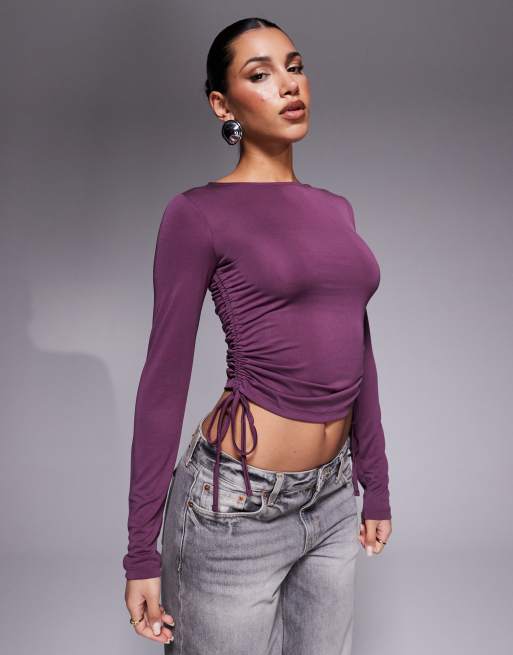 Top burdeos de manga larga con laterales fruncidos de tejido suave de ASOS DESIGN
