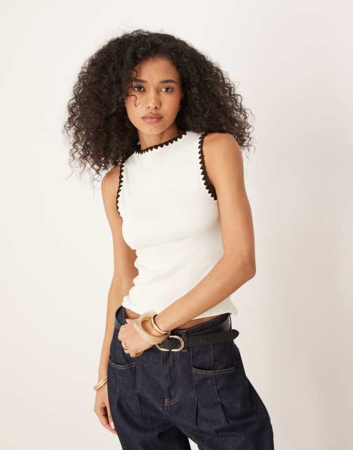 Top color crema sin mangas con cuello barco y detalle de pespuntes de festón de ASOS DESIGN