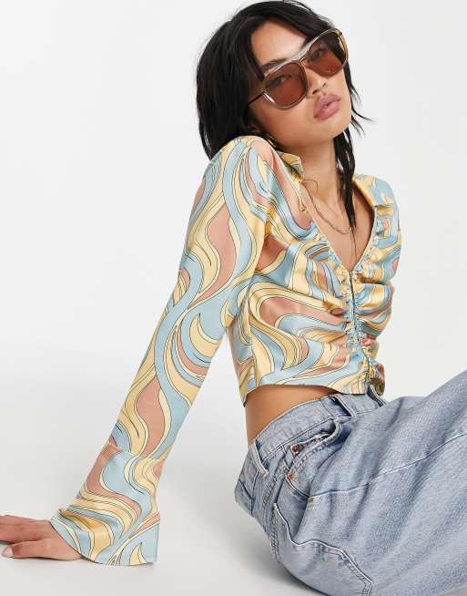 Top con estampado de remolinos, parte delantera fruncida y detalle de corchetes de satén de ASOS DESIGN