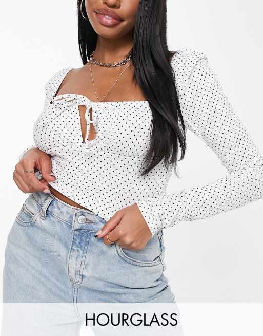 Top de copas grandes y manga larga con escote cuadrado, detalle de lazada y estampado de lunares de ASOS DESIGN