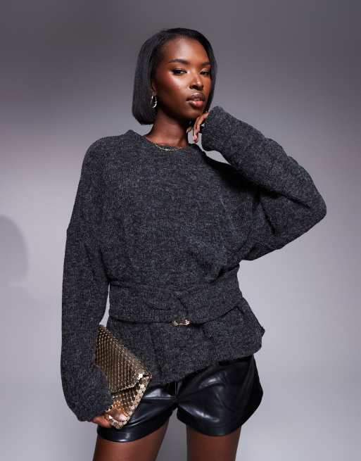 Top gris carbón de manga larga de bouclé acanalado con herraje dorado de ASOS DESIGN