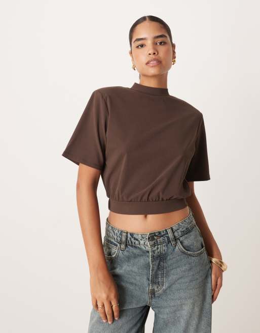 Top marrón chocolate estructurado con hombreras y detalle de abertura en la espalda de ASOS DESIGN