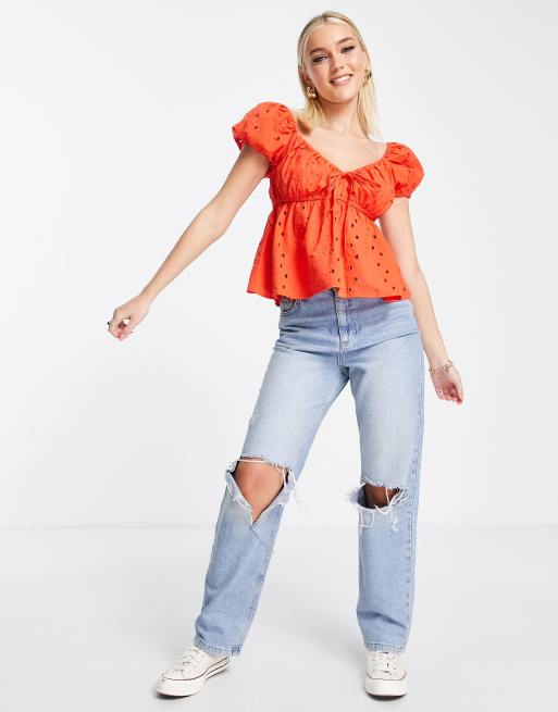 Top naranja luminoso amplio con detalle de cuello fruncido, mangas abullonadas y bordado inglés de ASOS DESIGN