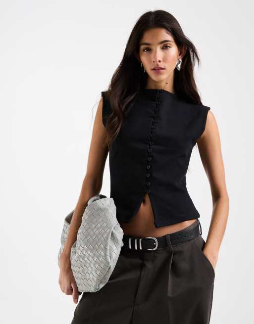 Top negro abotonado con mangas de hombro caído de algodón compacto de ASOS DESIGN